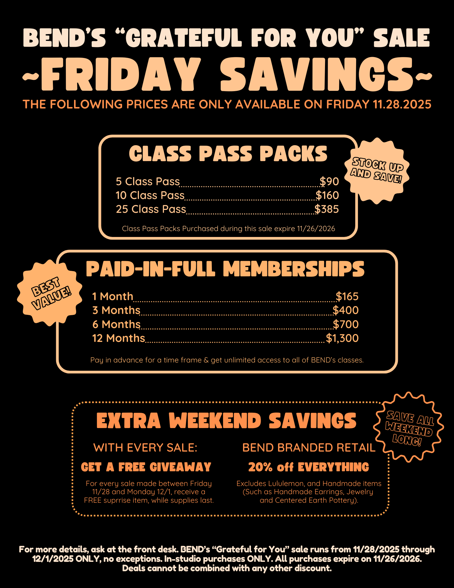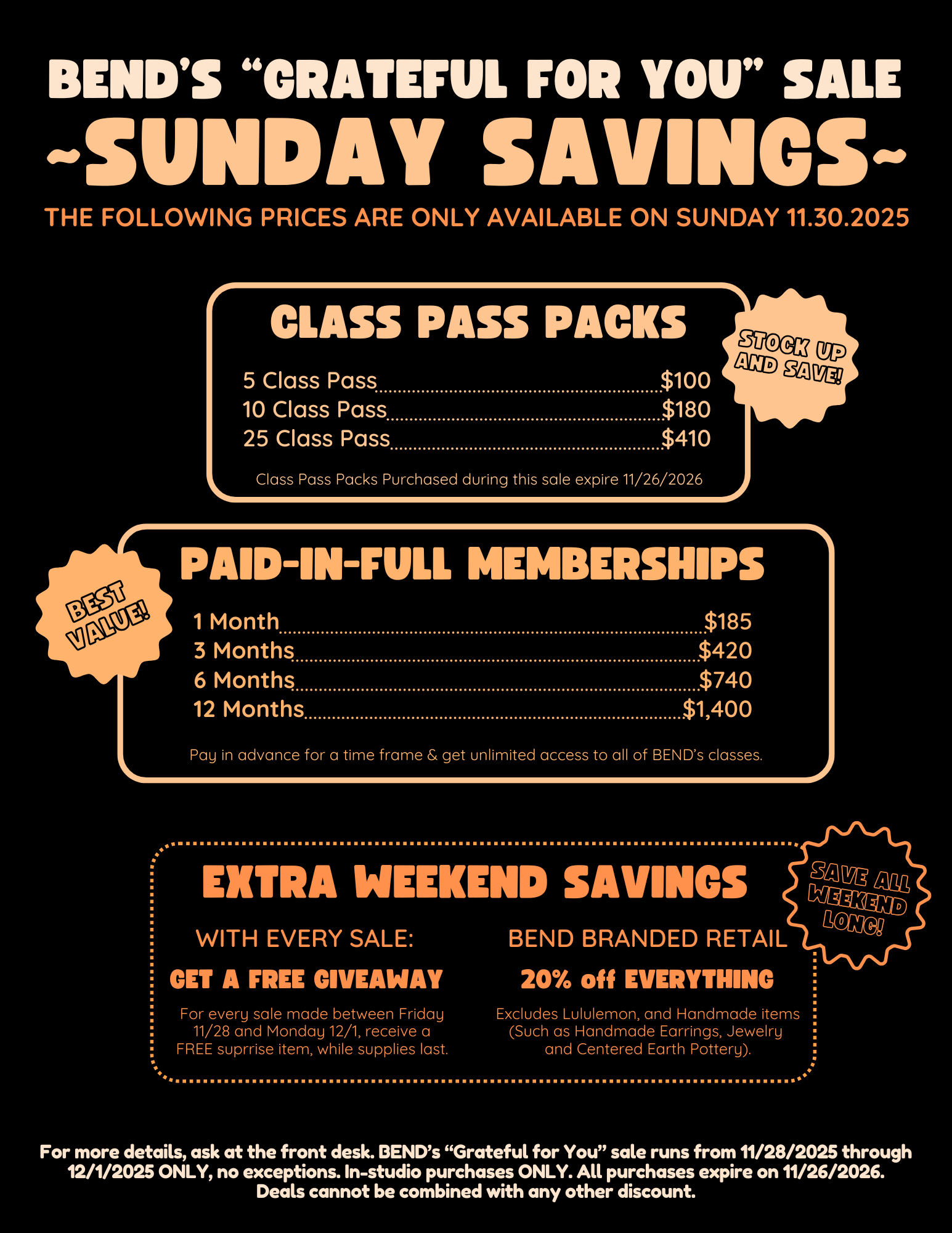 BEND’s “Grateful for You” sale runs from 11/28/2024 through 12/1/2024 ONLY, no exceptions. The above deals are available for in-studio purchases ONLY. All purchases expire on 11/26/2026. Deals cannot be combined with any other discount.
