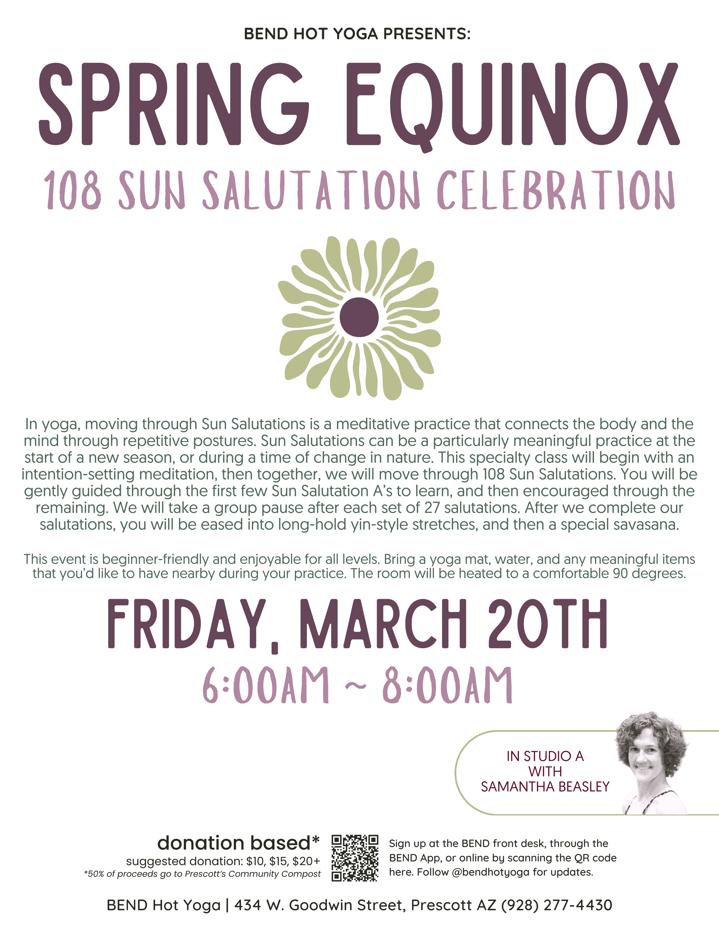 2026: Spring Equinox 108 Sun Salutation celebration Friday, March 20, 2026 6:00 AM 8:00 AM BEND Hot Yoga 434 West Goodwin Street Prescott, AZ, 86303 (928) 277-4430 (map) Google Calendar ICS Sign up Now