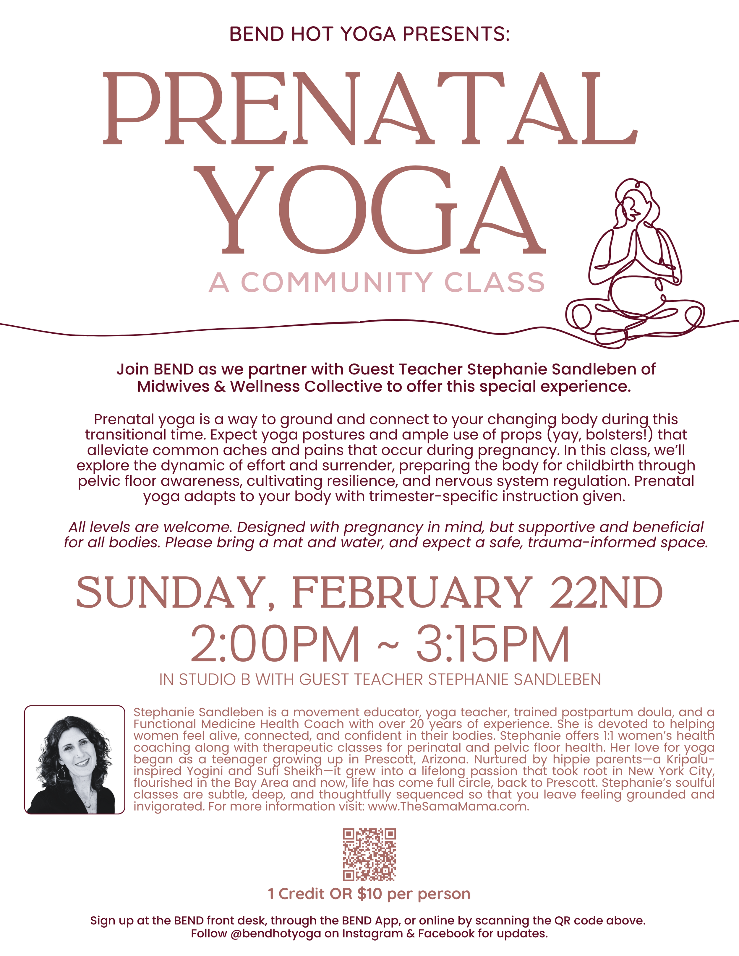 *Community Classes* Prenatal Yoga Sunday, February 22, 2026 2:00 PM 3:15 PM BEND Hot Yoga 434 West Goodwin Street Prescott, AZ, 86303 (928) 277-4430 (map) Google Calendar ICS Sign up Now
