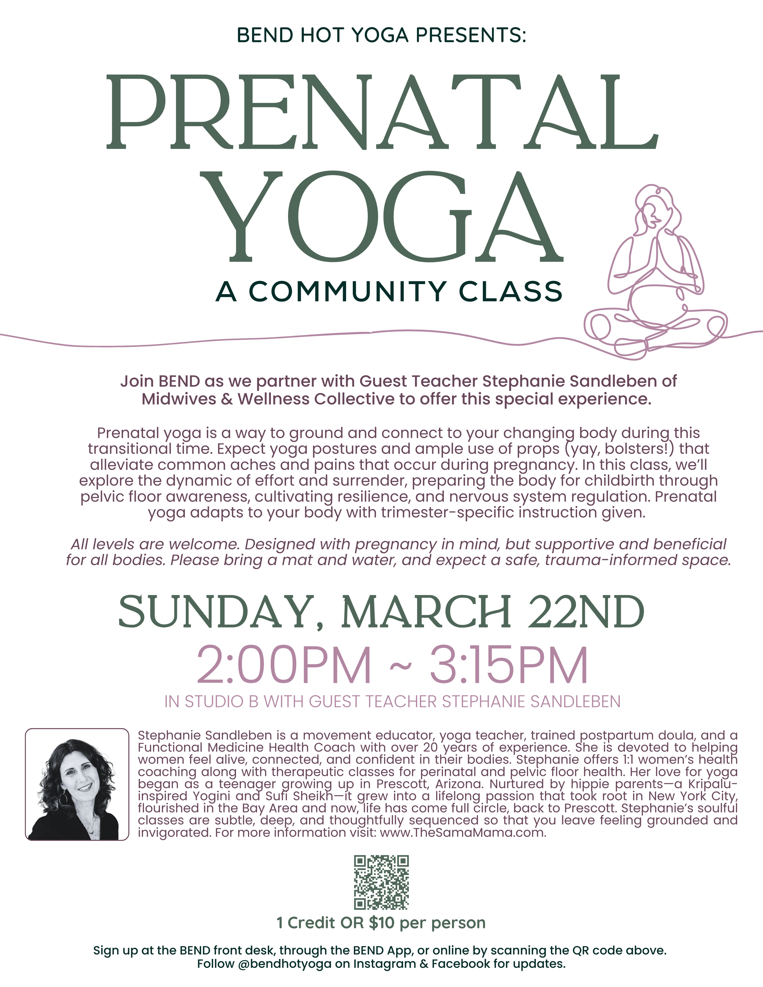 Back to All Events *Community Classes* Prenatal Yoga with special guest Stephanie Sandleben of midwives & wellness collective Sunday, March 22, 2026 2:00 PM 3:15 PM BEND Hot Yoga 434 West Goodwin Street Prescott, AZ, 86303 (928) 277-4430 (map) Google Calendar ICS Sign up Now